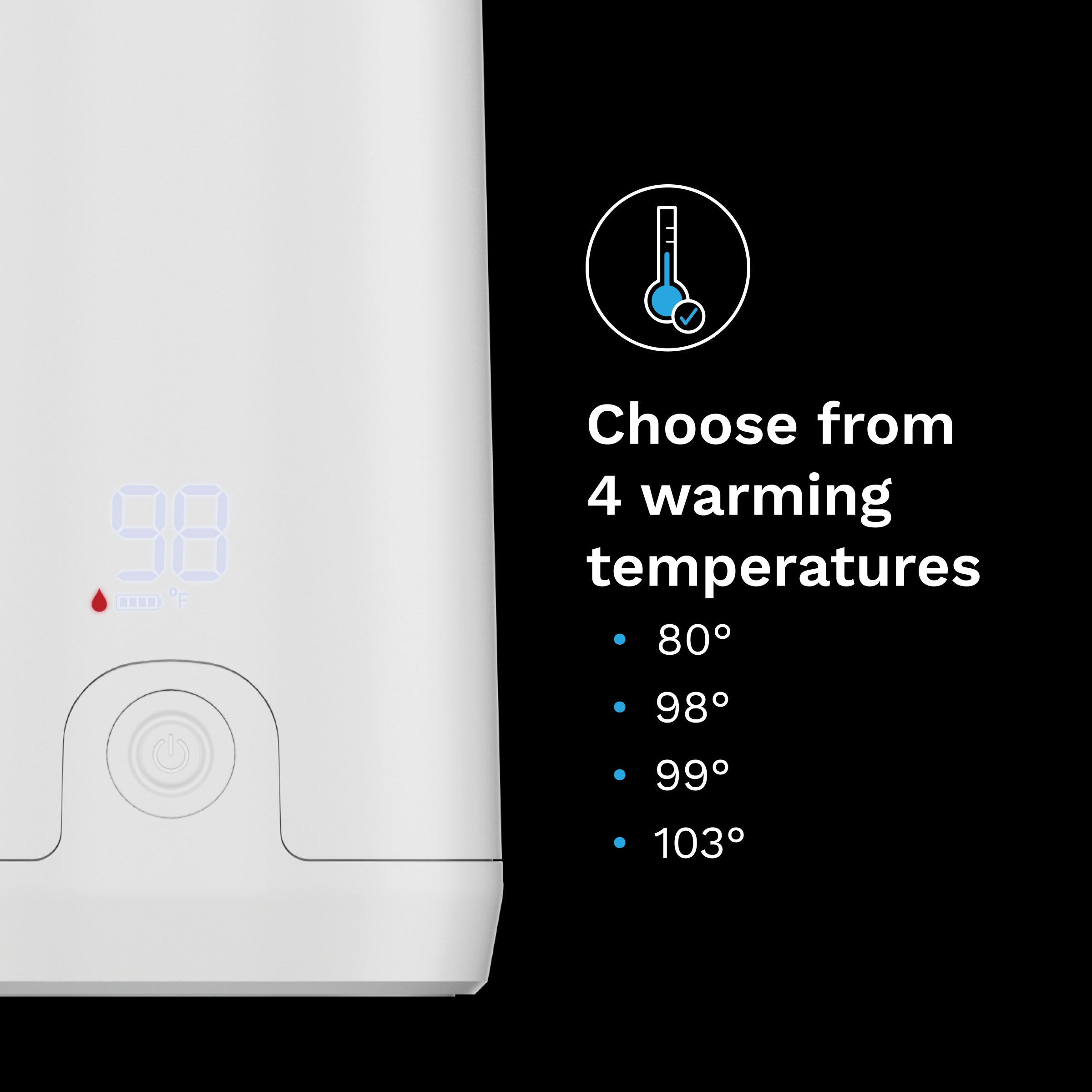 • Safely warms all milk types – Choose from 4 temperature settings: 80??. 98?? or 103??F for formula/water. or 99??F for milk storage bags